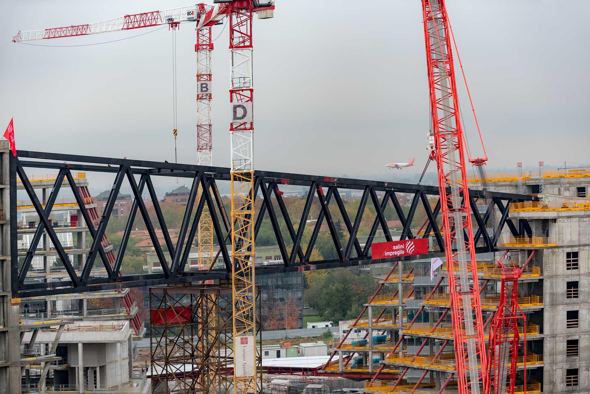 Le sfide progettuali più complesse sono quelle affrontate per la realizzazione dei ponti e delle strutture di trasferimento tra gli edifici, carpenterie imbullonate le cui membrature principali sono state parzialmente assemblate a piè d’opera e poi sollevate.